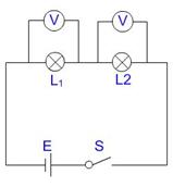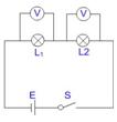 在电路中串联两个不同规格的灯泡,比较两灯的发光情况,并用电压表测量两灯两端的电压,分析电压与电功率的关系。