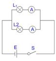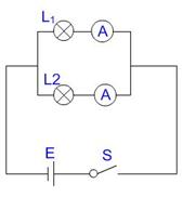 在电路中并联两个不同规格的灯泡,电压相等,比较两灯的发光情况,并用电流表测量