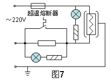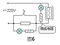 生:如图6,按下磁控开关,保温板短路,保温指示灯不发光,发热板接220V电压,电饭锅煮饭,限流电阻22kΩ,通过煮饭指示灯的电流0.01A,煮饭指示灯正常发光,指示煮饭。饭煮熟后,磁控开关自动跳起,发热板和保温板串联,电流最小,电饭锅保温,保温指示灯发光,指示保温。