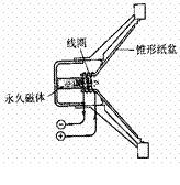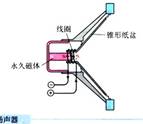 【结构】线圈(电磁铁部分)、永久性磁体(原来的磁场)、锥形纸盆(振动从而产生声音)。