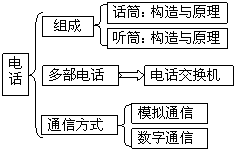 电话是由话筒和听筒组成的,话筒永远起把声音转变成电流,听筒永远起把电流再转变为声音的作用。老式话筒利用的是改变话筒电阻的方式把声音转变为变化的电流的,而新式话筒则是利用电磁感应现象把声音转变为电流的,方式不同,但目的是一样的。交换机的作用就是把众多的电话线有效地进行了整理,节约了导线。 | ||||