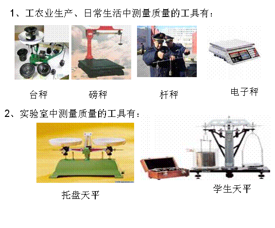 教师:虽然测量质量的仪器较多,但我们学校实验室中使用天平测质量,常见的天平有托盘天平和学生天平,我们初中阶段需要掌握托盘天平的使用方法。