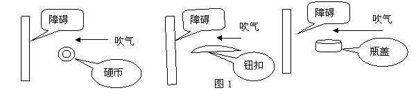 1.吹硬币(钮扣或瓶盖)。把硬币(钮扣或瓶盖)平放在桌面上,在其前面合适的位置放上课本和作业本及纸条或笔筒作为障碍,然后向硬币(钮扣或瓶盖)上方水平向前吹气,观察现象并记录。(图1)