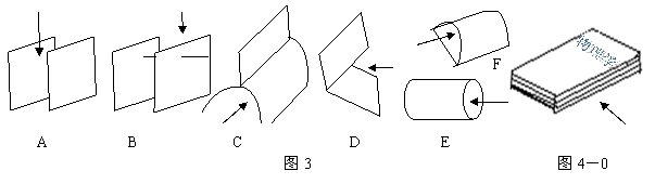 2.吹纸(条、片、环、椎、筒、卡)或书本。A、在一张纸(条、片、环、椎)或书本的上方吹气,观察现象(图2);B、向两张纸(卡)或纸筒的中间吹气,观察两张纸(卡)的运动或纸筒的形变情况(图3)。C、正对书、本用手翻的那个侧面吹气,观察书、本被翻动的情况(图4-0)。