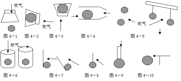 3.吹乒乓球。A.在桌子上放一个乒乓球,把自制的“漏斗”倒置于乒乓球的上方,从漏斗口向下用力吹气,观察现象(图4-1),然后将其横置和向上放置(图4-2、4-3),比较这些状态下吹气时的情况;B.换用侧边有孔的“漏斗”重复做图4-1、4-2、4-3的实验,观察球的运动情况;C.将球置于平放在桌面的“斗”较长的“漏斗”中,分别从两端向球吹气,观察球的运动情况(图4-4);D.将两个乒乓球放在水平桌上或用线拴好挂于笔杆上,向两个球中间用力吹气,观察现象(图4-5);E.将乒乓球放于杯中,向杯口水平方向或竖直向下吹气,观察球的运动情况(图4-6);F.将乒乓球靠在墙壁上或斜坡上,向球的前方吹气,观察球的运动情况(图4-7);G.将拴好的乒乓球挂在空中,然后向球的上方吹气,最后松开线,观察球的运动情况(图4-8);H.用笔筒向乒乓球吹气,观察笔筒下的球能不能被吸住(图4-9);I.将乒乓球放在水平桌面上,在其后竖放或斜放一块纸板,然后对着球吹气,观察球的运动情况(图4-10)。