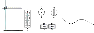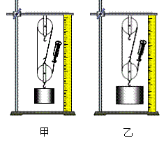 1、用细线将一个定滑轮和一个动滑轮连成滑轮组,挂在铁架台上,将细线一端拴在弹簧测力计上,在滑轮组下悬挂物块(第一次挂甲物块,第二次挂乙物块)。