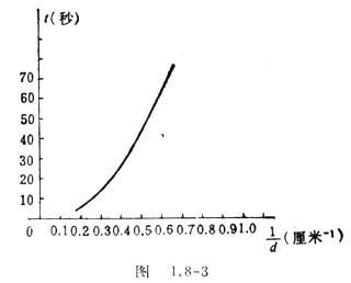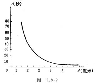 为了找出t和d之间的函数关系,根据表1中的数据作t—d曲线(图1.8-2为h0=300厘米时,t与d的关系图线)。从这条曲线不能看出t和d之间的函数关系,但该曲线与双曲线相类似。会使我们想到t和d之间是否满足反比关系。判断t和d之间是否存在反比关系的方法是作出t和1/d的关系曲线,若该图线是直线则t和d之间满足反比关系。