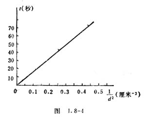 为了说明t与d之间的关系,可以作这样的假想:水流尽的时间应该和小孔的面积有关,而且可能是反比关系,也就是说尽可能与1/d2成正比。为检验这一假设是否成立,作t-1/d2的图象(图1.8-4)。