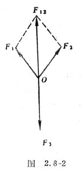3.去掉测力计和小铁环。沿力的作用线方向移动三个有向线段,使其始端交于一点O,按平行四边形定则求出F1和F2的合力F12。比较F12和F3,在实验误差范围内它们的大小相等、方向相反,是一对平衡力,即它们的合力为零。由此可以得出F1、F2 、F3的合力为零是物体平衡的条件,如图2.8-2。