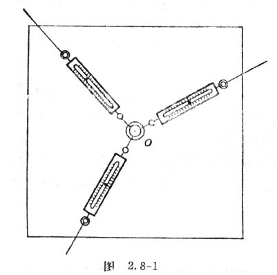 2.将小铁环放在方木板上,固定一个测力计,沿两个不同的方向拉另外两个测力计,如图2.8-1。平衡后,读出测力计上拉力的大小F1、F2、F3,并在纸上按一定的标度,用有向线段画出三个力F1、F2、F3。把这三个有向线段廷长,其延长线交于一点,说明这三个力是共点力。