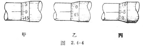 校准好的千分尺,当测微螺杆与测砧接触后,可动刻度上的零线与固定刻度上的水平横线应该是对齐的,如图2.4-4甲所示。如果没有对齐,测量时就会产生系统误差──零误差。如无法消除零误差,则应考虑它们对读数的影响。若可动刻度的零线在水平横线上方,且第x条刻度线与横线对齐,即说明测量时的读数要比真实值小 x/100毫米,这种零误差叫做负零误差,如图2.4-4乙所示,它的零误差为-0.03毫米;若可动刻度的零线在水平横线的下方,且第y条刻度线与横线对齐,则说明测量时的读数要比真实值大y/100毫米,这种零误差叫正零误差,如图2.4-4丙所示,它的零误差为+0.05毫米。
