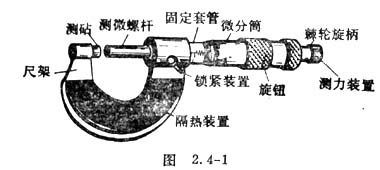 外径千分尺常简称为千分尺,它是比游标卡尺更精密的长度测量仪器,常见的一种如图2.4-1所示,它的量程是0-25毫米,分度值是0 .01毫米。外径千分尺的结构由固定的尺架、测砧、测微螺杆、固定套管、微分筒、测力装置、锁紧装置等组成。固定套管上有一条水平线,这条线上、下各有一列间距为1毫米的刻度线,上面的刻度线恰好在下面二相邻刻度线中间。微分筒上的刻度线是将圆周分为50等分的水平线,它是旋转运动的。