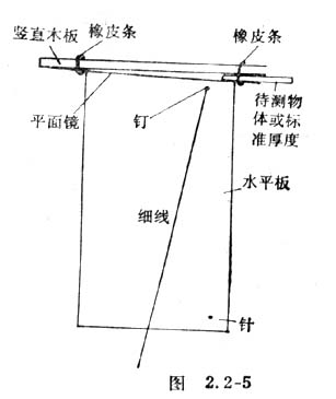 将一页已知厚度的纸插入玻璃板和平面镜之间,找出细线对准针的像的新方向,记细线在标尺上的读数。将两页书纸插入,找出细线在标尺上的读数,依此类推,就对光学测微计进行了粗略的标度,如图2.2-5。