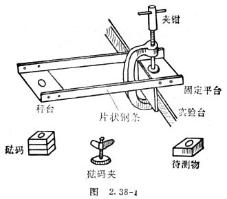 惯性秤是用振动法来测定物体惯性质量的装置,它的主要组成部分,如图2.38-1所示:放置砝码或待测物的秤台,固定整个装置的固定平台,连结固定平台和秤台的两条相同的片状钢条,几块相同的砝码(砝码中心有孔,以便固定在秤台上),固定砝码的砝码夹。