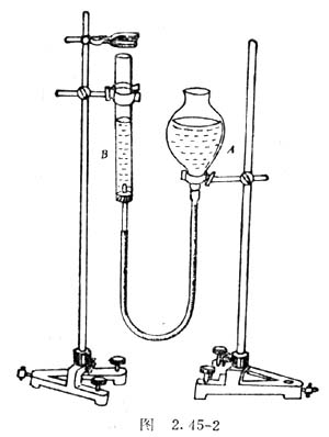 1.将玻璃管、橡皮管漏斗等按图2.45-2安装好。玻璃管下端装上一穿孔软木塞,细玻璃短管一头插在B管底部的软木塞中,另一头跟橡皮管相连。漏斗A要选大些的,其容积大致与玻璃管B的容积相当。