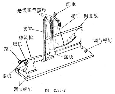 1.将冲击摆(图2.33-2)放在桌面上,弹簧枪尾部正对实验者。调节底板上的调节螺钉使底板大致呈水平。调整四根悬线的长度,使摆块上表面呈水平,侧面与刻度板平行,前端面与刻度板的零刻度线对齐(若没有对齐,可调整底座上位于一侧中部的螺钉),后端面的入射孔与弹簧枪口正对(偏左或偏右时,也可调节调节螺钉)。 SPAN>