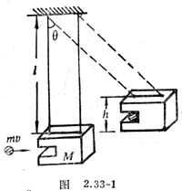 如图2.33-1,如果质量为m的弹丸以某一速度v水平射入悬挂着的质量为M的静止摆块中并一起以共同速度v′运动,则在射入过程中,由动量守恒定律得: