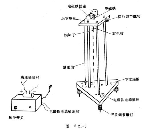 1.如图2.21-3,把描迹仪竖直放置。在上支座板上装一重垂线。调节下支座板上的竖放调节螺钉,使重垂线与导电管平行(其重锤尖与下支座板上的孔正对)。将描迹电源的脉冲开关扳向下方,用高压插接线把描迹电源与描迹仪上的“+”、“0”插接孔相连,把电磁铁电源输出线插入电磁铁电源插座。把电磁铁插件插入上支座板插件孔内,并将其线圈引出线插入电磁铁插座(如图所示)。在导电管上卷上墨粉纸和白纸,用夹子夹好。