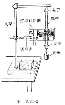 1.将方座支架放于水平桌的边沿,打点计时器固定于支架的下端并位于竖直平面内。支架底座上放一重物以保持支架的稳定。打点纸带上端穿过计时器的限位孔,并用夹子固定起来,下端通过夹子悬挂一重锤,如图2.21-2。