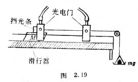 利用气垫导轨做实验来验证牛顿第二定律。在图2.19中,当滑行器质量M远大于砝码质量m时,可以认为滑行器水平运动时受的合外力等于mg。研究质量一定时,加速度与 合外力的关系,以及合外力一定时,加速度与质量的关系,即可验证牛顿第二定律。