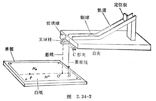 1.把碰撞实验器固定在桌边(如图2.34-2),固定时注意使导轨下段水平。在地上铺好木板,把白纸铺在木板上钉好。系好重垂线(其悬点应在导轨下沿正下方)。在白纸上描出锤尖在白纸上的投影点O。把钢球从定位板处自由释放,观察球的落点位置,然后在该点处铺上复写纸,重复实验,定出球的平均落点P。在纸上画出过O、P的直线。