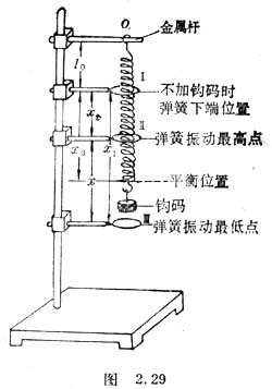 如图2.29,设弹簧自然长(未挂钩码时弹簧下端的簧头距悬点O的距离)为L0,弹簧下挂质量为m的钩码后,平衡时弹簧的伸长量为 x0。竖直下拉钩码后放手,让弹簧振子振动,且振动到最高位置时,弹簧长度大于L0。设振子在最低位置和最高位置时弹簧的伸长量分别为x1和x2,则振动中钩码上升的高度为x=x1-x2,且x的中点在平衡位置处。设弹簧的倔强系数(劲度系数)为k,则