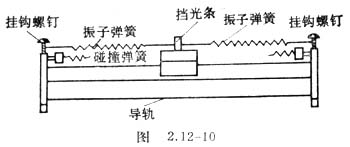 实验时在导轨两端盖上安装弹簧挂钩,并在滑行器的两端也安装弹簧挂钩,在滑行器中间位置安装挡光条,将两个弹簧如图2.12-10挂在滑行器和两端盖之间。通气后滑行器将在弹簧的作用下做简谐运动。注意弹簧的长度和安装高度要合适,不要使它们收缩下垂时接触气轨表面。