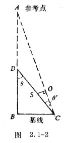 如图2.1-2,在B点观察几十米以外的物体D,A为BD延长线上极远处的一个参考点。人沿垂直于ADB方向移动到C点(BC称为基线)再观察D。由于A点极远,可以认为< /SPAN>BA∥CA,即∠θ=∠θ′。在CD线上取点S过SO作SO⊥CA,可以看出ΔBCD∽ΔOSC,如果OS、OC和BC长度已知,则