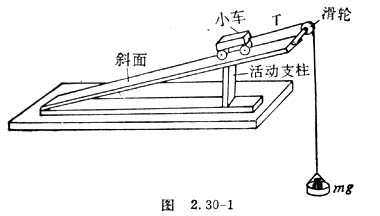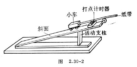 2.用天平称出小车的质量m,保持斜面倾角不变,在斜面顶端装上电磁打点记时器。把纸带穿过打点记时器后系在小车上,如图2.30-2。拉引纸带,使小车停在打点计时 器附近。接通电源,使打点计时器工作,放开小车,打出纸带后断开电源。