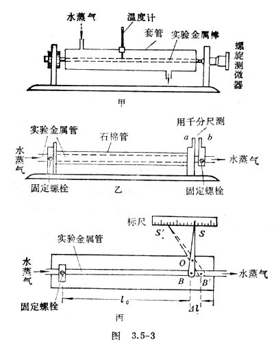 固体线胀系数测定的关键在于伸长量ΔL的测定。下面介绍图3.5-3甲、乙、丙所示的三种膨胀仪的设计原理。