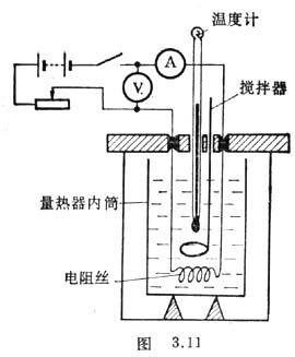 如图3.11,设量热器内筒和搅拌器的总质量为m筒(由同种材料制成),内盛质量为M液的液体,初温为t1。当对电阻丝通电t秒后,液体末温为t2。设通电时电流表、电压表示数分别为I和U,则通电时间内电流做的功为