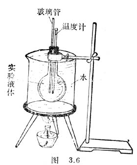 实验采用图3.6装置。双孔橡皮塞的孔内插有均匀内径的玻璃管和温度计,烧瓶内装满液体,用胶塞封住。若事先测得玻璃管总长L和它里面的液体体积Vt,则实验中玻璃管内液柱长度改变量ΔL与体积变量ΔV有以下关系