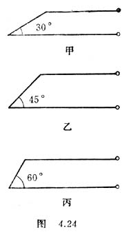 电流天平(J2408型),直流电流表2个(J0407型或J0407-1型),滑动变阻器2个(J2354-4型),蓄电池2个(J1203型)或学生电源2个(J1202-1型3A),单刀开关2个(J2352型),三角板,刻度尺,导线若干,电流天平横臂上除了U形导体外,还应各有导线的短边与长边夹角为30°、45 °、60°的导线框。如图4.24所示。这些导线框短边边长应相同。