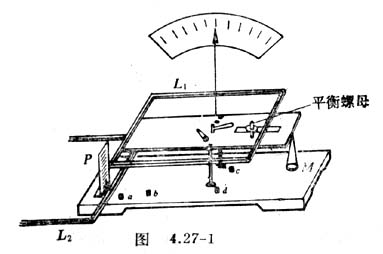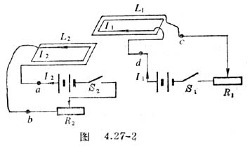 2.将L1、L2分别与电源、电流表、变阻器连成如图4.27-2所示的电路。(L1、L2最靠近的两边电流应同向)