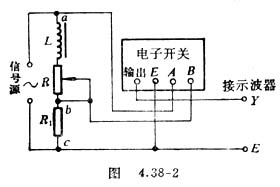 1.将滑动变阻器R、可拆变压器的线圈L(L取0-220伏初级线圈)和取样电阻R1接成串联电路,a、b两端接到电子开关的两个输入端A和B,C接电子开关和示波器的公共接地端E,电子开关的输出端接到示波器的Y输入,整个电路如图4.38-2所示。