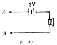 把动圈扬声器(或耳机、舌簧喇叭)线圈的一端试触一节干电池的正极,另一端同时试触干电池的负极,能从扬声器的纸盆中听到咯咯声。如果像图4.45那样,用两节干电池和一个扬声器组成一个简易的测试器,就能用它做晶体二极管单向导电性的实验和测试晶体三极管管脚的实验。