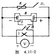 1.按图4.10-2连接电路。图中B为气压式可调内阻电池,a为简式电阻箱,S1是单刀开关,V是直流电压表,S是双刀双掷开关。为了用一个直流电压表既能测量外电路两端的电压(电压表的正、负极分别接到电池的正、负极上),又能测量内电路两端的电压(即测量两探针间的电压,由于在电池的内电路中,电流的方向是由电池的负极到电池的正极,因此靠近电池负极的探针的电势高于电池正极旁边探针的电势,这就要求直流电压表的正极与靠近电池负极的探针相连),因此,双刀双掷开关的连线要按图4.10-2所示连接。