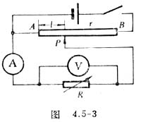 1.如图4.5-3所示,将滑动变阻器用分压接法接入电路,电源选择6伏输出。电阻箱开始置于1欧姆,滑动变阻器滑片P置于A点,使它的电压输出为零,这时L=0。记下电压表的读数。