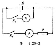 1.按图4.20-3接好电路,R为5-10欧定值电阻,E为待测内电阻的干电池,电压表用3伏挡,电流表用0.6安挡。