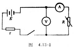 2.按图4.13-1接好电路,R为电阻箱,E为学生电源,选择12伏输出,V为电压表选取15伏挡,A为电流表选取0.6安挡,r为假内阻(20欧)。