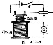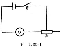 1.将变阻器、电源、检流计(或发光二极管)、开关组成图4.30-1所示电路。把变阻器阻值调至最大,瞬时闭合开关,观察检流计指针的偏转方向与电流方向的关系(若图中G表处连入的是发光二极管,观察二极管的发光情况与电流方向的关系,还应将二极管反接后再观察一次)。电源电压取1.5-2伏,当接发光二极管时,r取200欧;接检流计时,r改用标称值为10千欧的电位器或标称值75千欧的碳膜定值电阻。