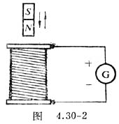 2.把检流计与副线圈连成闭合电路,如图4.30-2所示。做当磁铁插入线圈时、放在线圈中一不动时、从线圈中拔出时三种情况的实验,观察每次检流计指针的偏转情况,填写表格1。