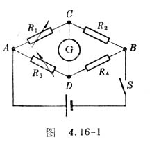 图4.16-1是一种特殊结构的电路──直流单臂电桥,R1、R2、R3和R4叫电桥的臂,检流计G接于CD之间称为“桥”。一般情况下R1、R3两端的电压不相等,即C、D两点间的电势不等,G中有电流通过。改变R1、R3的大小,可以使UAC=UAD,这时G中无电流通过。当G中无电流时叫做“电桥平衡”。本实验就是研究R1、R2、R3和R4之间满足什么关系时电桥平衡。