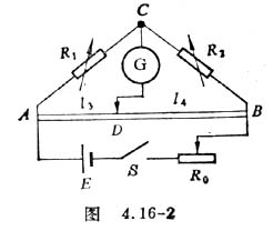 1.将直线电桥的电阻丝AB(附在标尺上)、电阻箱R1、R2,检流计G,滑动变阻器R0,电源E和开关S接成如图4.16-2所示电路。D为电阻丝上滑动头,并带有按键开关,将D按下时,桥的支路才接通。电阻丝AB粗细均匀,故其阻值与长度成正比。