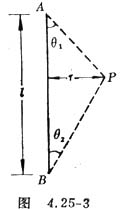 2.由毕奥-萨伐尔定律,距长为L的通电直导线的r处,电流I的磁场的磁感应强度为 (图4.25-3。当θ1=θ2=θ,即P距A、B等远时,。当θ=0,即导线无限长时,。由图知。当L=1米,r=0.1米时,此时。把它看做无限长载流导线,B的相对误差为δ=(1-0.9806)/0.9806=0.01978,即相对误差不超过2%。