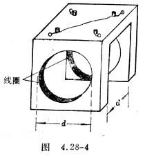 2.关于亥姆霍兹线圈的绕制。线圈采用直径为0.5-0.6毫米的漆包线,每个线圈绕300匝,线圈的内直径d应比电子束管最大外径稍大,以便能套在电子束管上。两线圈最好能固定在框架内,如图4.28-4所示,两线圈距离也为d。框架上表面有四个接线柱,分别与两线圈的引出线相连。