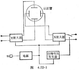 如图4.22-1,J2459型示波器包括以下各部分:(1)示波管;(2)垂直偏转放大器(Y放大器);(3)水平偏转放大器(X放大器);(4)扫描电压发生器;(5)电源。
