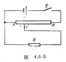 在分压接法中,滑动变阻器输出的电压范围是0≤U≤E。如果R>>r,在图4.5-5中,RAC≈r1,UAC=(r1/R)E,即输出电压与滑动变阻器电阻成线性变化。如果R<<r,可分两种情况讨论:(1)r1<R时,UAC≈(r1/R)E,即UAC随r1线性变化,考虑到R<<r,r1变化范围不会很大。(2)R<<r1时,UAC=(R/(R+r-r1))E所以在R<<r,时UAC和滑片移动的距离基本上按对数关系变化。如图4.5-6所示,上式中的r1与图中的L成正比。所以在分压接法中,电压调节范围大,且在R>>r时可以得U和L的线性关系,故实际电路中多采用分压接法。