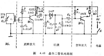 图4.46为一晶体二管收音机电路图,用虚线隔开的五个部分分别是调谐电路、高频放大、检波、音频放大和电源。