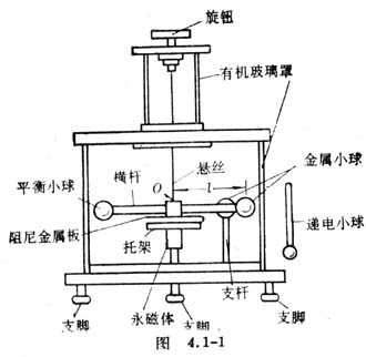 仪器的中心轴上装有一个永磁体托架,旋开其上紧固螺钉,可使托架升降,以改变永磁体和横杆上的阻尼金属板的距离,调整横杆转动的电磁阻尼时间。